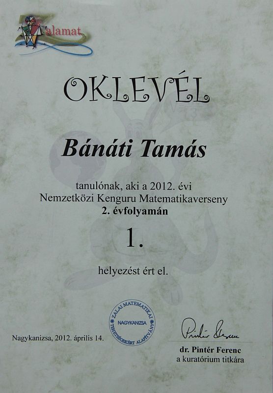 Wir sind ganz stolz auf den Schüler Tamás Bánáti aus der Klasse 2. a, der am Internationale Mathematik Känguru Wettbewerb unter der zahlreichen Teilnehmer den ersten Platz belegen hat.