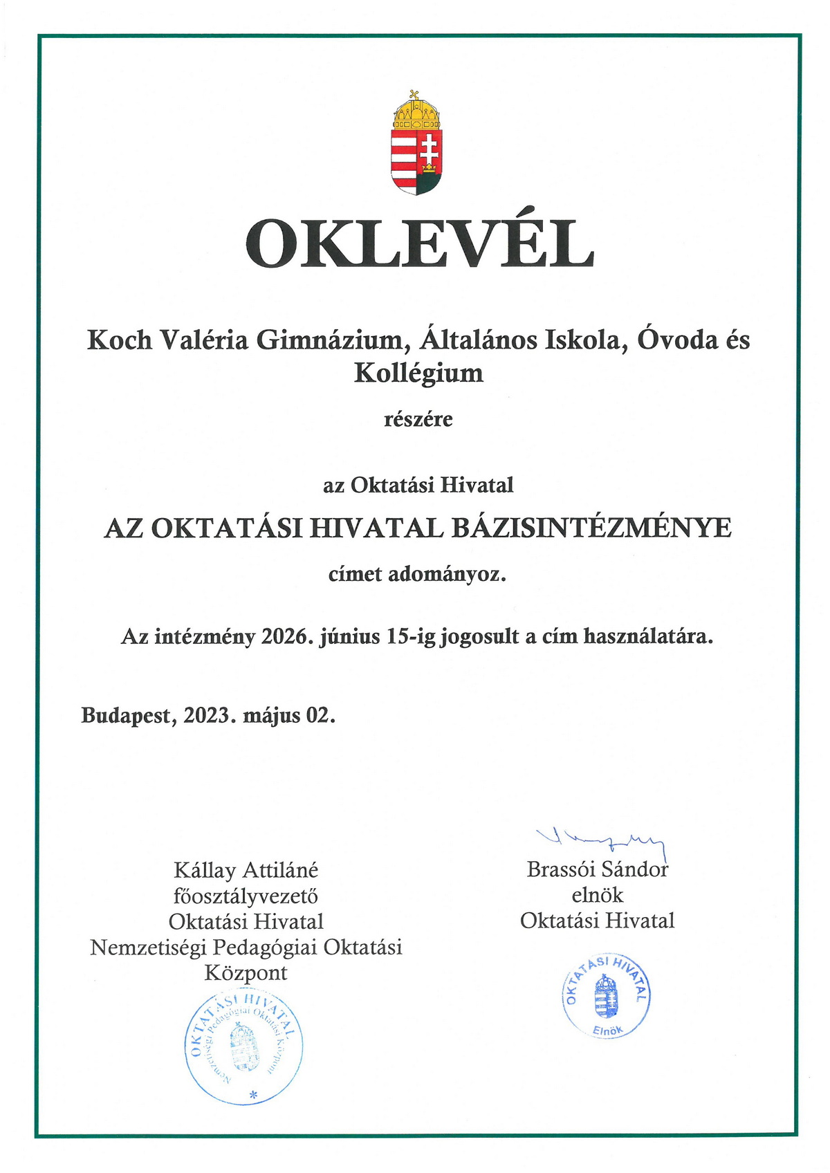 Intézményünk 2023-ban harmadik alkalommal nyújtott be pályázatot Az Oktatási Hivatal Bázisintézménye cím elnyerésére. Az Oktatási Hivatal által kiírt pályázaton - a Pedagógiai Oktatási Központ és a bíráló bizottság javaslatai alapján - az Oktatási Hivatal köznevelési elnökhelyettese a rendkívül magas szakmai színvonalú pályamunkák közül a Koch Valéria Gimnázium, Általános Iskola, Óvoda és Kollégiumot érdemesnek ítélte az Oktatási Hivatal Bázisintézménye cím viselésére.